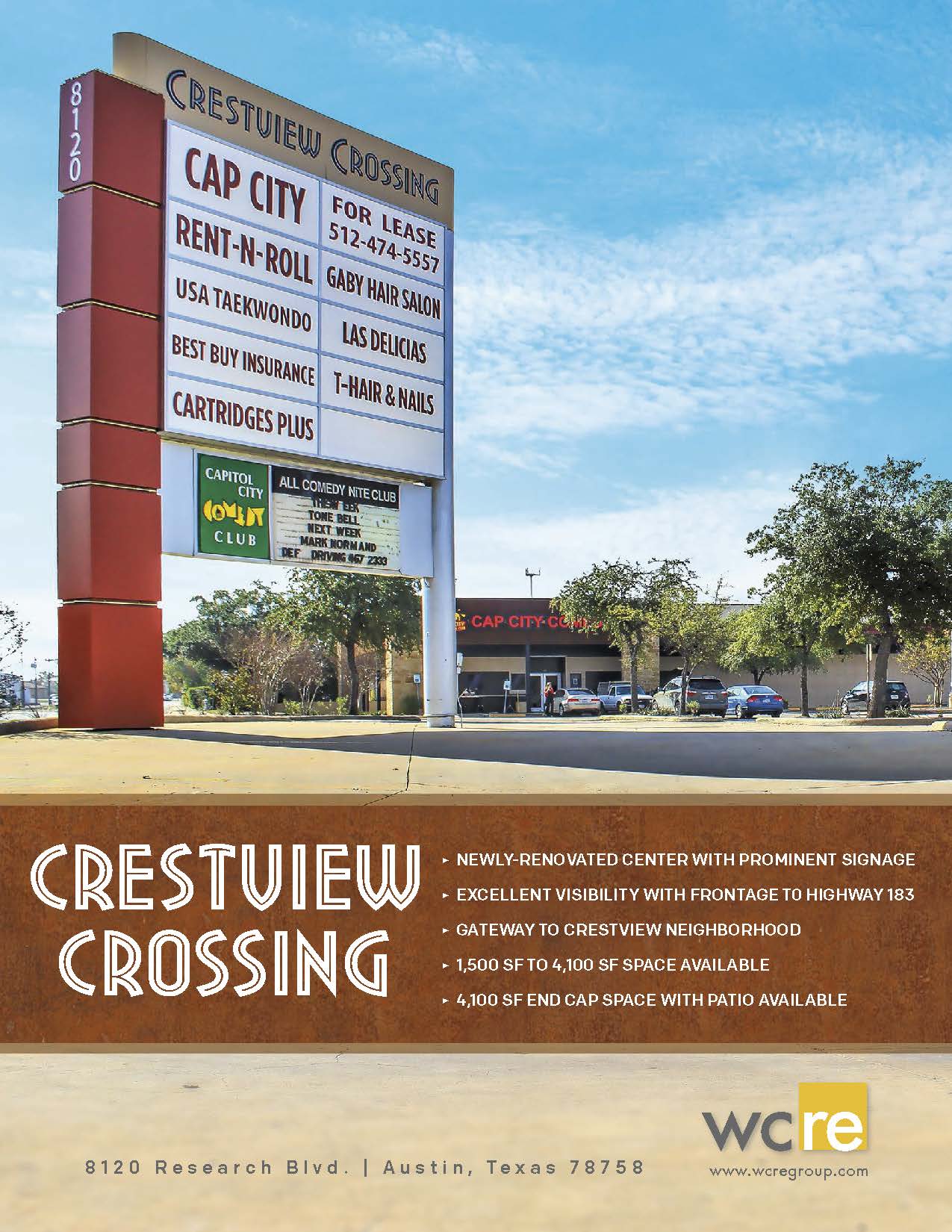 Crestview Crossing is a 41,400 square foot retail neighborhood shopping center located at 8120 Research Boulevard. The center has a prime location in the heart of North Central Austin within the highly desirable “Crestview” neighborhood. Current tenants include the long-running and celebrity comic-famous Capital City Comedy Club, Rent-N-Roll, Mercado Karate, Best Buy Insurance, Las Delicias ice cream shop, Toro Imports, and Radiante Salon, with the Flying Pig coming soon. Crestview has access to over 150,000 residents in a three-mile radius, and the area’s demographics support the center’s long-term ability to attract customers. Crestview Crossing has a few remaining opportunities, including the endcap space fronting along Research Blvd, and is a perfect fit for hip local tenants looking to serve the everyday needs of the growing Crestview neighborhood demographic.